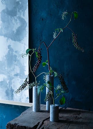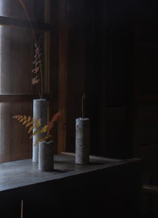フラワーベース「碑美」は 明治29年創業の⾺渡⽯材産業を担う⽯⼯職⼈を訪ね、墓⽯の⽔鉢に着⽬して⽣まれたアップサイクルのプロダクト。昔ながらの職⼈技術に新しい感性を吹き込むことで、⾃然の⼿ざわりと空気感を楽しめる⽣活雑貨へと昇華しました。